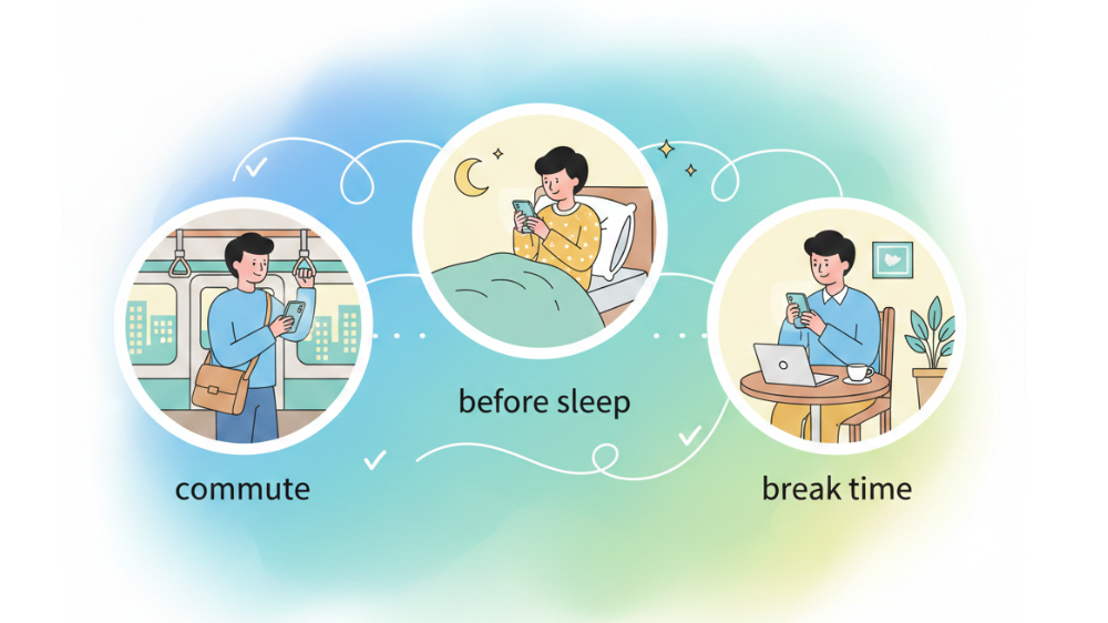 英会話アプリを続けられるかどうかは、学習意欲だけで決まるものではありません。生活環境やその時々の忙しさによって、使える時間や集中力は変わります。そのため、時間帯や利用頻度を固定しなくても使える柔軟性は、長期的な利用を支える要素になります。