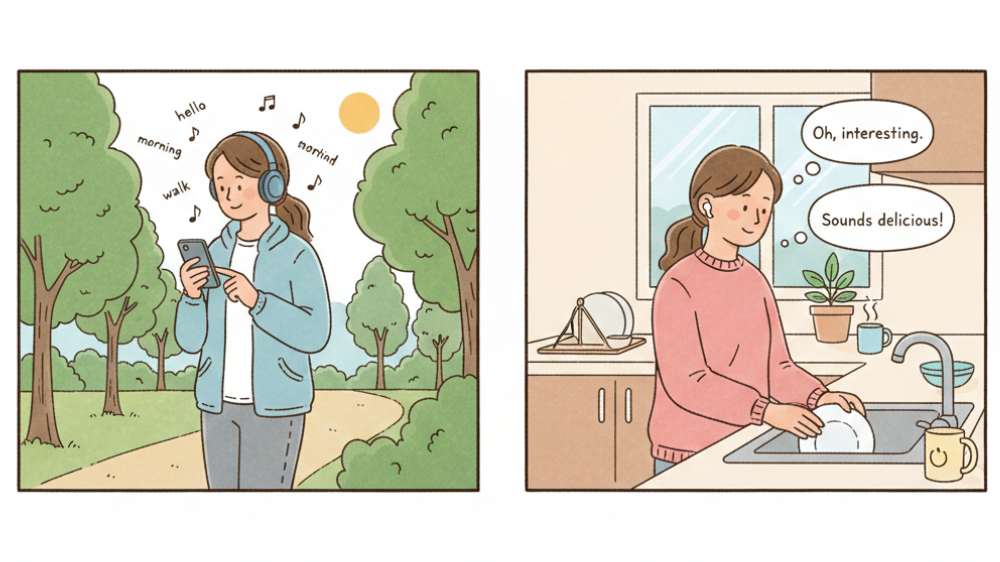 特別な時間を確保しようとすると、続けること自体が負担になることがある。短時間でも、日常の流れの中で英語の音に触れる機会を作る方が、自分に合っていると感じる人も多い。重要なのは量よりも、自分の生活と衝突しない形かどうかである。