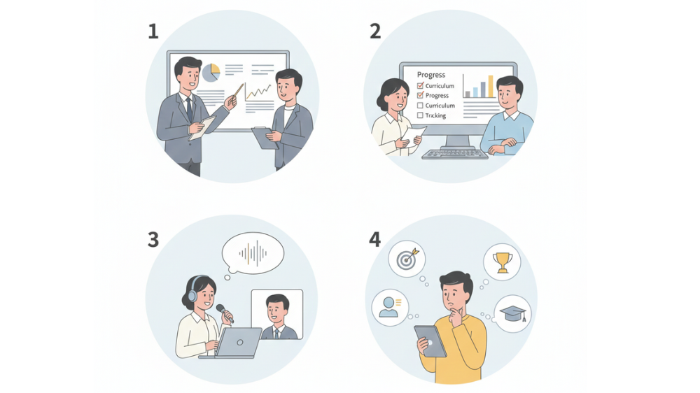 高額英会話スクールを選ぶ際に見落とせないのが、カリキュラムの内容や講師の質です。同じ料金でも、学習内容や指導方法、講師との相性によって、学習効果は大きく変わります。スクールごとに重点を置く分野やレッスンの進め方が異なるため、カリキュラムの構成や講師の経験・指導スタイルを理解することが、スクール選びの重要なポイントになります。
